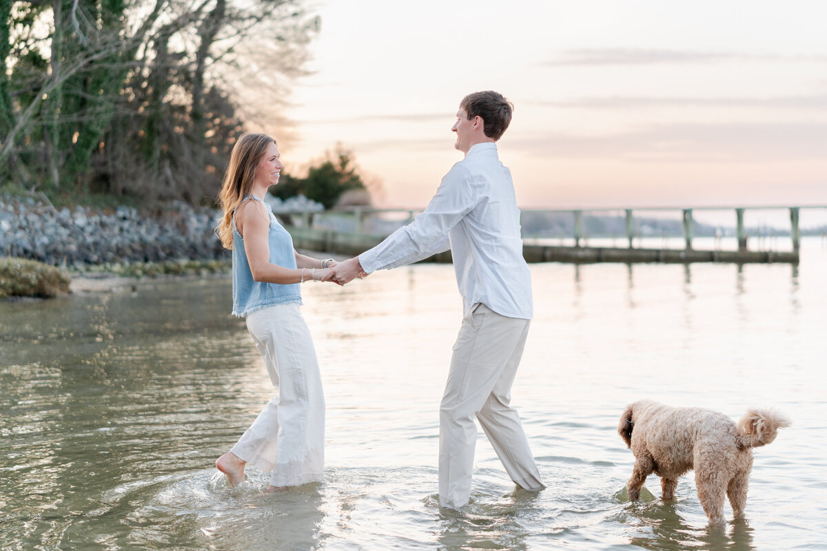 Jordan and Garrett’s beach session on the Chesapeake Bay was the dreamiest! These two were all in—embracing every creative pose and even hopping into the water for some magical shots. Their chemistry was shining, and they truly enjoyed every moment together, making the session feel relaxed and full of joy. To make it even more perfect, they brought along their adorable pup! With stunning golden light, their playful energy, and some truly romantic beach vibes, their session was a perfect mix of fun and heartfelt moments—one of my favorites to capture!